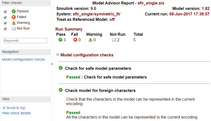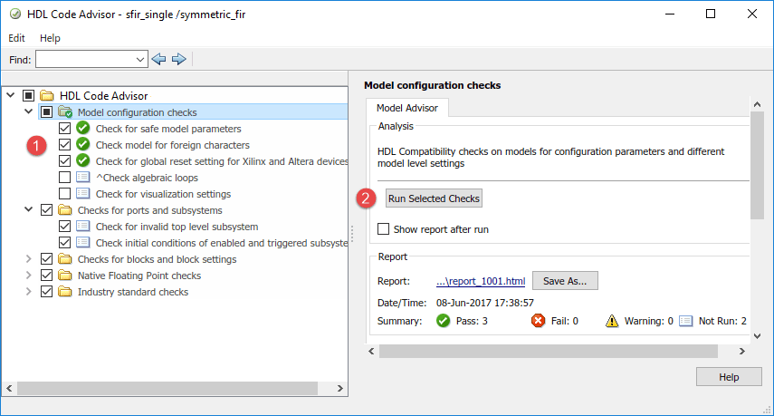 При применении проверок Model Advisor к модели повышается вероятность того, что модель не нарушит определенные стандарты или рекомендации моделирования. Однако это не гарантирует, что конструкция готова к генерации кода HDL. Убедитесь, что проект проверен с помощью нескольких методов готовности к созданию кода HDL.