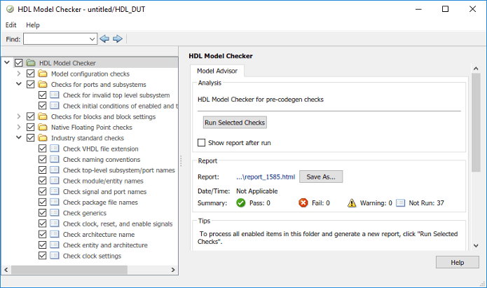 При выполнении этой команды средство проверки совместимости HDL создает отчет о проверке генерации кода HDL. Отчет хранится в целевом объекте hdlsrc папка. Если отчет не содержит ошибок, это означает, что модель совместима с генерацией кода HDL.