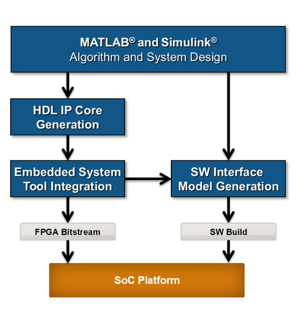 MATLAB и Simulink Algorithm and System Design: Вы начинаете с реализации своего дизайна в MATLAB или Simulink. Когда поведение конструкции соответствует вашим требованиям, решите, как разделять конструкцию: какие детали вы хотите запускать на оборудовании и какие вы хотите запускать во встроенном ПО.