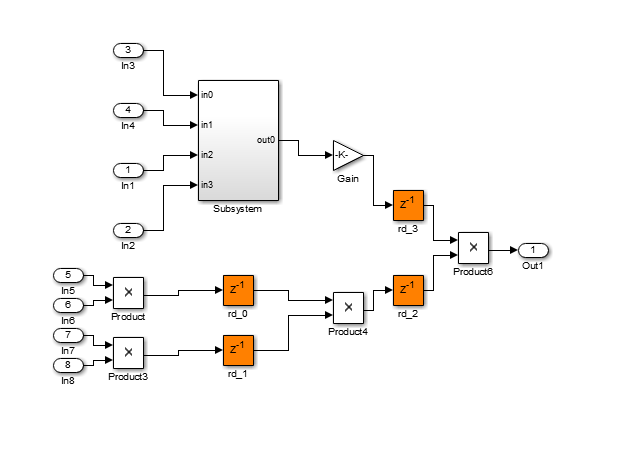 Если для подсистемы в иерархии не включена распределенная конвейерная обработка, Coder™ HDL не перемещает задержки по этой подсистеме.