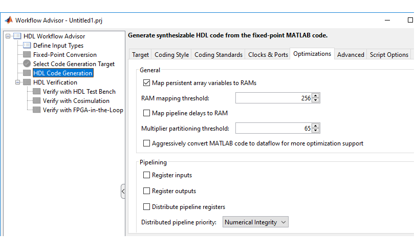 В помощнике по рабочим процессам HDL выберите MATLAB to HDL Workflow > Code Generation (Создание кода) > Optimizations (Оптимизации).