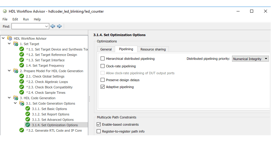 В помощнике Simulink ® HDL Workflow Advisor выберите задание Задать параметры генерации кода > Задать параметры оптимизации.
