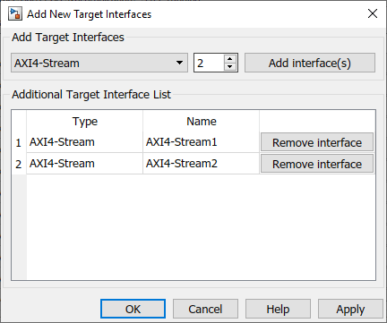 Чтобы добавить дополнительные интерфейсы, в plugin_rd каждый раз, когда требуется добавить дополнительные интерфейсы, вызывайте метод интерфейса. В этом примере показано, как добавить два AXI4-Stream интерфейса.