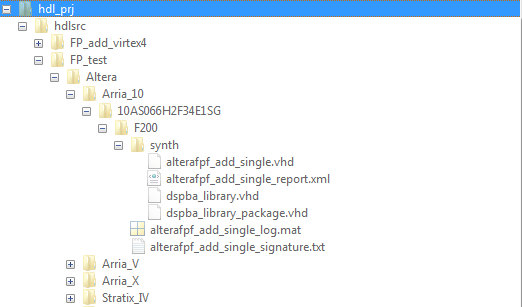 Для просмотра результатов сопоставления библиотеки FPGA с плавающей запятой можно просмотреть базовые файлы IP, созданные после генерации кода HDL.