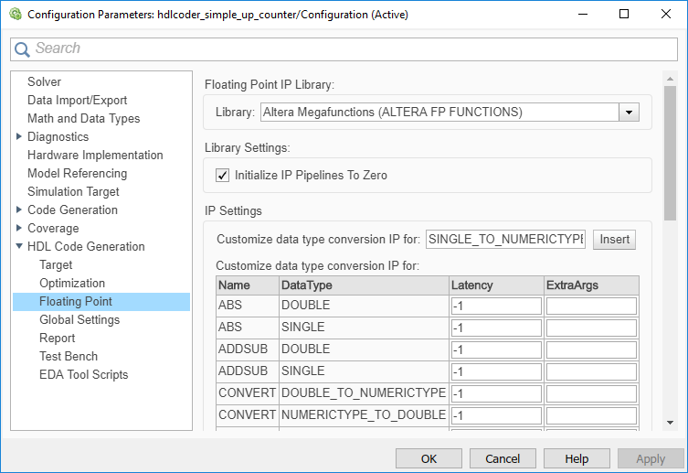 fpconfig = hdlcoder.createFloatingPointTargetConfig('ALTERAFPFUNCTIONS');