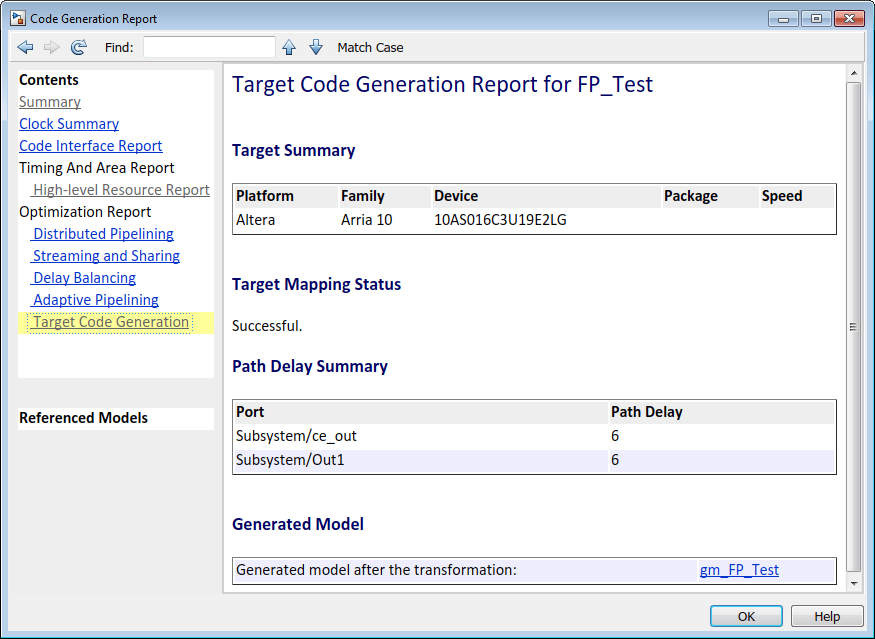 В разделе «Отчет о создании кода» отчета «Отчет об оптимизации» отображается состояние параметров оптимизации, применяемых к модели. Отчет показывает, успешно ли создан целевой код с плавающей запятой кодером HDL.