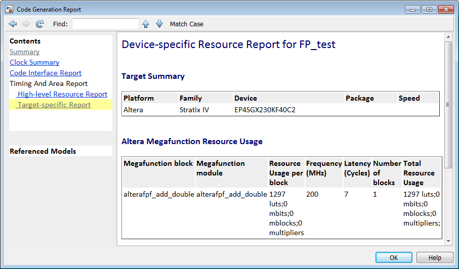 Чтобы увидеть целевой блок с плавающей запятой, на который сопоставлена конструкция, задержку и количество аппаратных ресурсов для конкретного объекта, в разделе Отчет о создании кода выберите Отчет для конкретного объекта.