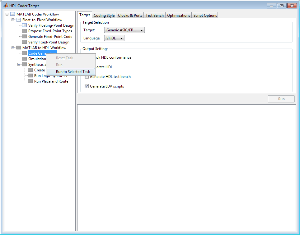 HDL Workflow Advisor - это инструмент, поддерживающий набор задач, охватывающих этапы процесса разработки ASIC и FPGA, включая преобразование алгоритмов MATLAB ® с плавающей запятой в алгоритмы с фиксированной запятой. Некоторые задачи выполняют проверку или проверку кода; другие запускают генератор кода HDL или сторонние инструменты. Каждая папка на верхнем уровне помощника по рабочим процессам HDL содержит группу связанных задач, которые можно выбрать и запустить.