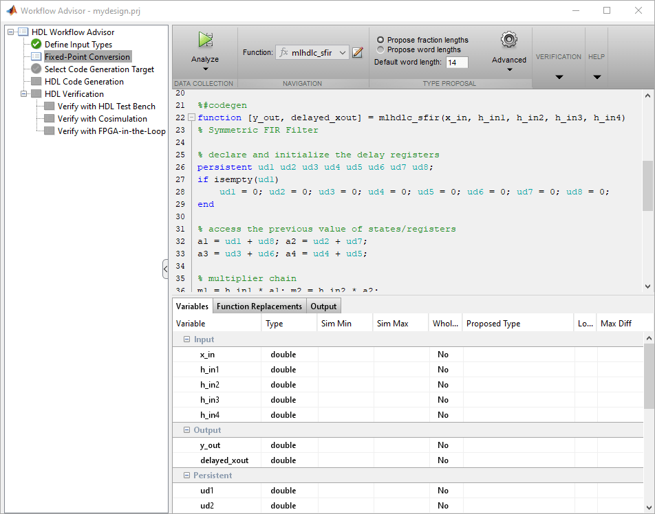 Если у вас уже есть алгоритм MATLAB с фиксированной точкой, установить для Design необходимость преобразования в Fixed Point? кому No чтобы пропустить этот шаг.