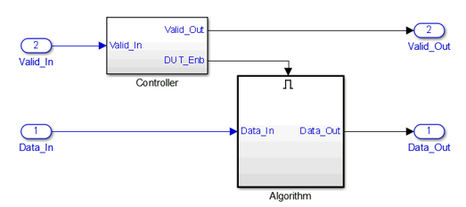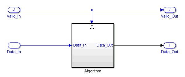 Подсистема алгоритма потоковой передачи соответствует тому же шаблону моделирования сигналов Data и Valid, что и шаблон для отображения скалярных портов на интерфейсы AXI4-Stream. См. раздел Данные модели и допустимые сигналы в Simulink.