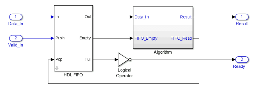 Например, если в DUT имеется First in first out (FIFO) для хранения кадра данных, для приложения противодавления к входному компоненту моделируйте сигнал Ready на основе сигнала FIFO Full.