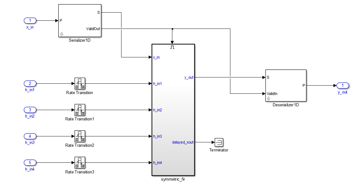 Для отображения векторных портов на AXI4-Stream интерфейсы откройте hdlcoder_sfir_fixed_vector.slx модель. В hdlcoder_sfir_fixed_vector.slx symmetric_fir блок является подсистемой алгоритма потоковой передачи.