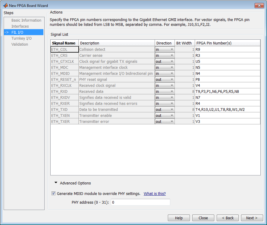Создание модуля MDIO для переопределения настроек PHY: См. следующий раздел на FPGA Board Management Data Input/Output Bus (MDIO), чтобы определить, когда использовать эту функцию. Если эта опция выбрана, введите адрес PHY.