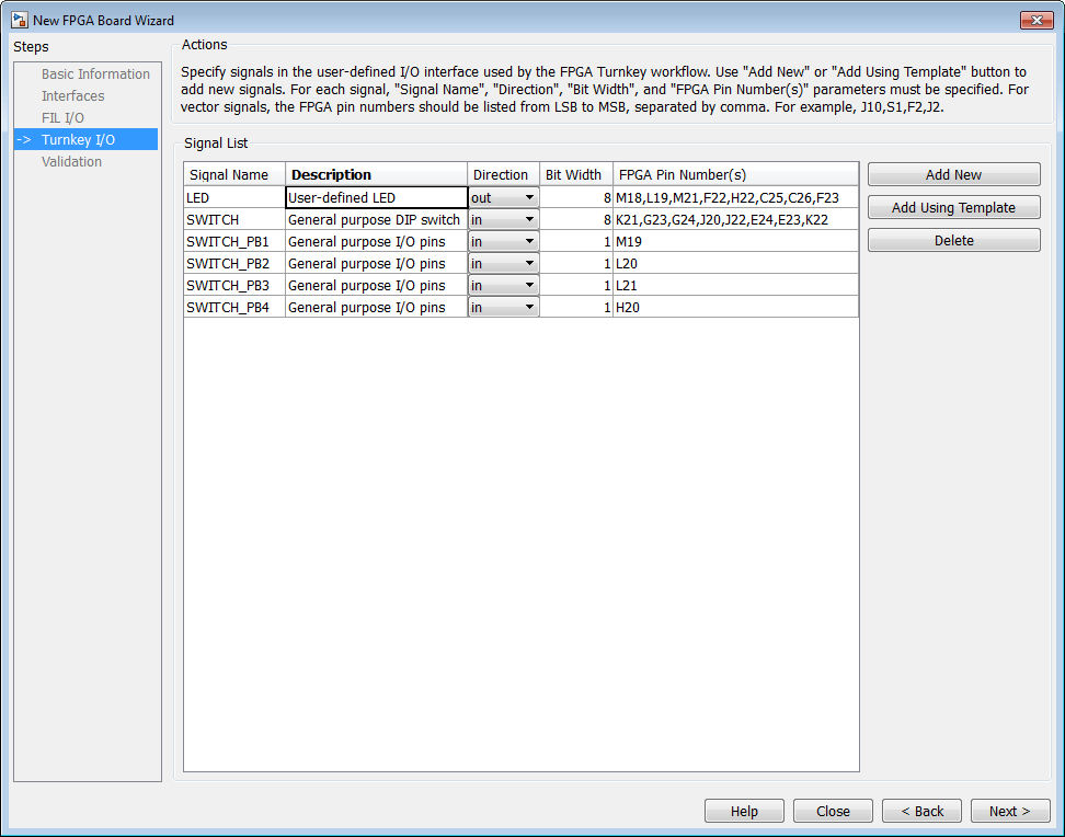 Список сигналов: Укажите все номера контактов FPGA для указанных сигналов. Эта информация содержится в файле спецификации платы. Для векторных сигналов перечислите все номера контактов в одной строке, разделенные запятыми. Количество номеров выводов должно соответствовать битовой ширине соответствующего сигнала.