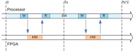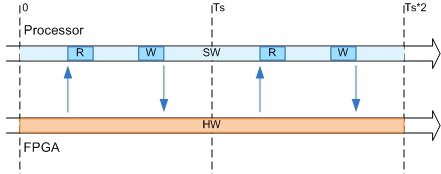 На следующей схеме показано, как процессор и FPGA могут взаимодействовать в режиме свободной работы. Затененные области указывают, что процессор и FPGA работают непрерывно.