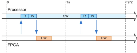 На следующей схеме показано, как процессор и FPGA работают в режиме блокирующей сообработки.