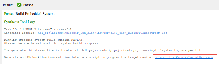 % This script was generated using the following parameter values: % ... % Set properties related to 'RunTaskProgramTargetDevice' Task hWC.RunTaskProgramTargetDevice = true; hWC.ProgrammingMethod = hdlcoder.ProgrammingMethod.Download; % Validate the Workflow Configuration Object hWC.validate; %% Run the workflow hdlcoder.runWorkflow('hdlcoder_led_blinking/led_counter', hWC);