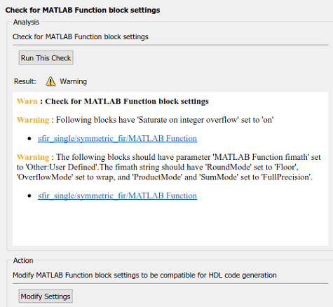 Некоторые проверки имеют подпанель действия. В этом примере показаны неправильные настройки функционального блока MATLAB, вызвавшие появление предупреждения при проверке.