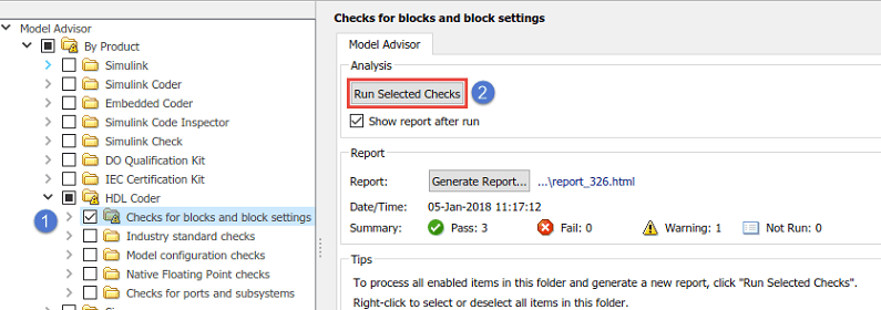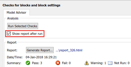кнопку, чтобы выполнить выбранные проверки в Model Advisor.
