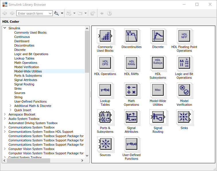 hdllib отображает блоки, совместимые с для генерации кода HDL в браузере библиотеки. Здесь отображаются только те блоки, для которых у вас есть лицензия. При построении моделей с использованием блоков из этого вида браузера библиотеки модели совместимы с генерацией кода HDL.