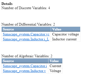 После выполнения задачи Проверить коммутируемую линейную (Check Switched Linear) задача сообщает количество дифференциальных и алгебраических переменных для каждой сети Simscape, присутствующей в модели. Например, этот рисунок иллюстрирует, что в модели примера повышающего преобразователя есть две дифференциальные и две алгебраические переменные sschdlexBoostConverterExample.