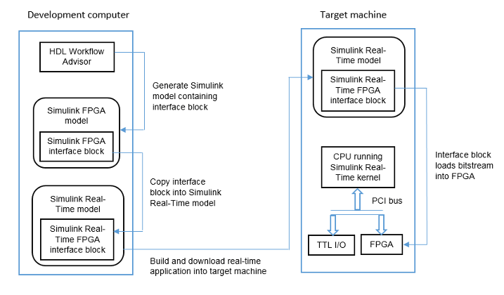 После создания битового потока FPGA рабочий процесс создает модель Simulink ® Real-Time™. Модель представляет собой модель интерфейсной подсистемы, которая содержит блоки для программирования FPGA и обмена данными с модулем ввода-вывода через PCI-шину во время выполнения в реальном времени .