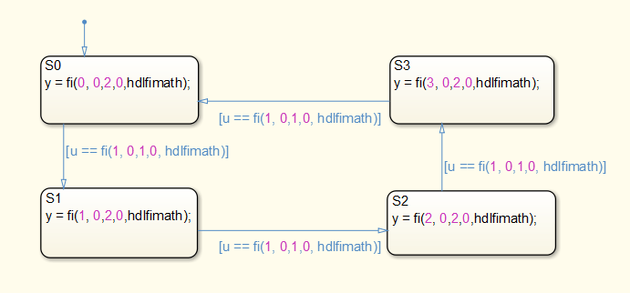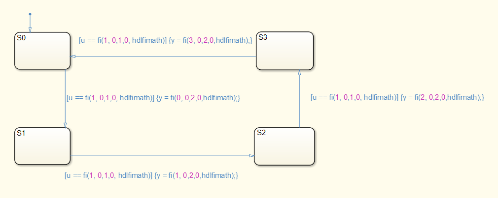 На следующем рисунке показан пример диаграммы, моделирующей конечный автомат Mealy с использованием MATLAB в качестве языка действий.