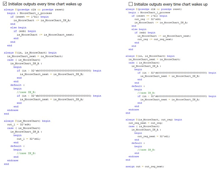 На этом рисунке показан код Verilog, созданный для этой диаграммы Мура, с параметром «Инициализировать выходы при каждом пробуждении диаграммы» и без него.