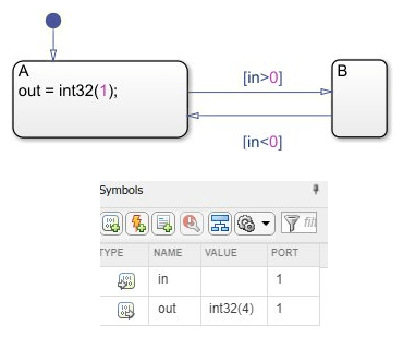 При выборе параметра «Инициализировать выходные данные при каждом пробуждении диаграммы» значение выходного значения возвращается к 4 за исключением случаев, когда конечный автомат находится в состоянии A. Государство A устанавливает выходные данные на 1. При отключении параметра «Инициализировать выходные данные при каждом пробуждении диаграммы» выходное значение не возвращается к 4.