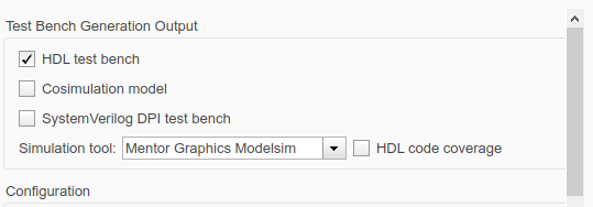Если требуется создать код тестового стенда Verilog, можно указать этот параметр на панели Создание кода HDL (HDL Code Generation) диалогового окна Параметры конфигурации (Configuration Parameters).