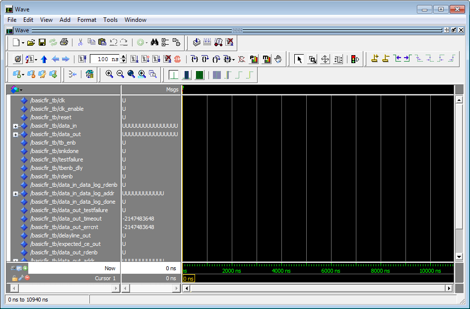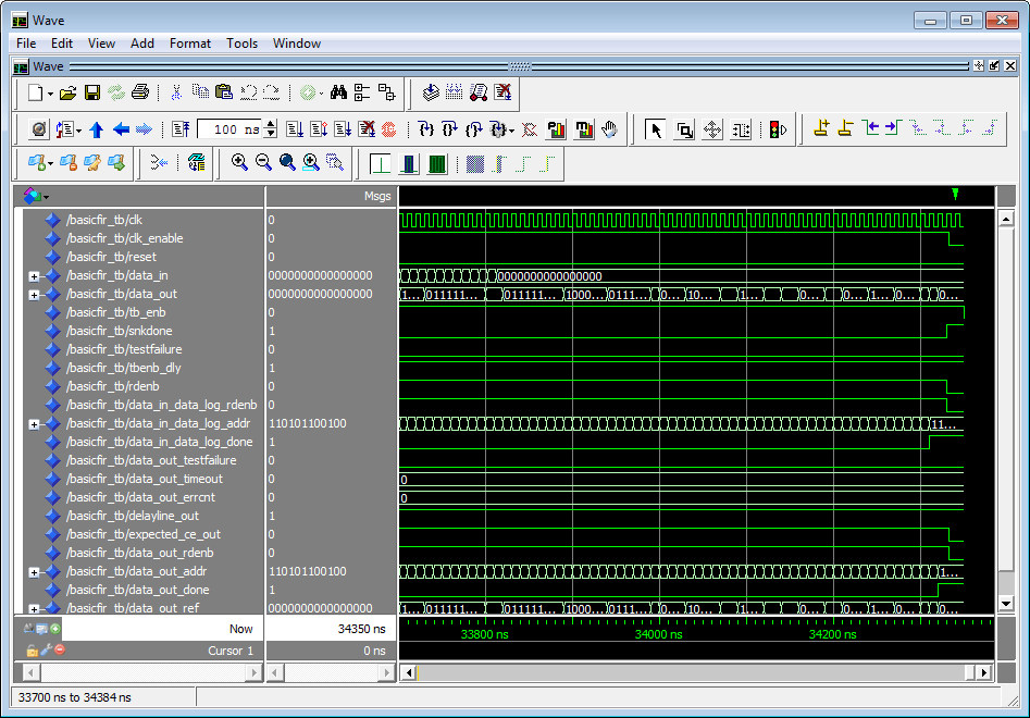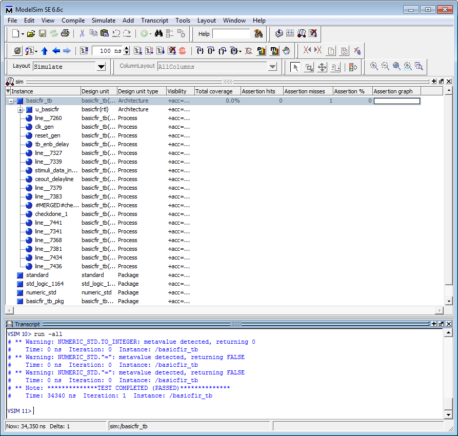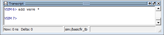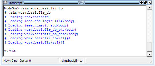 На следующем рисунке показаны результаты загрузки work.basicfir_tb с vsim команда.