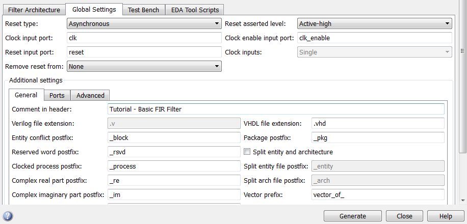 Выберите вкладку Глобальные параметры пользовательского интерфейса. Затем перейдите на вкладку Общие раздела Дополнительные параметры пользовательского интерфейса. Напечатать Tutorial - Basic FIR Filter в текстовом поле Комментарий в заголовке. Кодер добавляет комментарий к концу блока комментариев заголовка в каждом созданном файле.