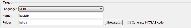 В текстовом поле «Имя» на панели «Цель» замените имя по умолчанию на basicfir. Этот параметр задает имя объекта VHDL и файла, содержащего код VHDL для фильтра.