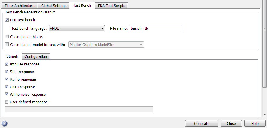Перейдите на вкладку Test Stench (Испытательный стенд) в диалоговом окне Generate HDL (Генерировать ЛПВП). В текстовом поле Имя файла замените имя по умолчанию на basicfir_tb. Этот параметр определяет имя созданного файла тестового стенда.