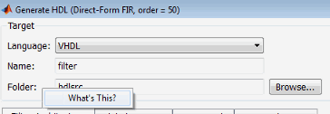 Нажмите Что это? Контекстно-зависимое окно справки отображает информацию, описывающую параметр Папка. Настройте содержимое и стиль созданного кода HDL, используя контекстную справку для получения дополнительной информации по мере работы. Для каждого параметра доступен раздел справки.