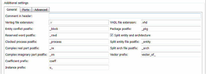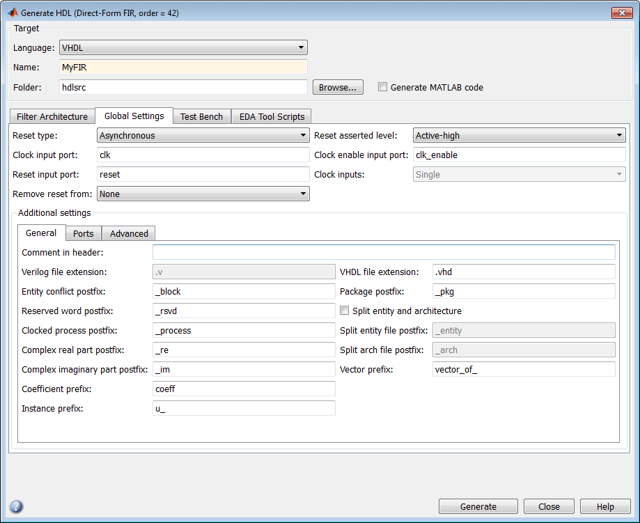 При выборе генерации кода VHDL по умолчанию файлы HDL фильтра генерируются с помощью .vhd расширение файла. При выборе Verilog по умолчанию используется расширение файла .v. Чтобы изменить расширение файла,