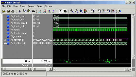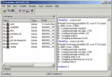 Скомпилировать созданные файлы VHDL фильтра и тестового стенда. В симуляторе Mentor Graphics ModelSim выполняется компиляция кода VHDL с помощью vcom команда. Следующие команды компилируют код VHDL тестового стенда фильтра и фильтра.