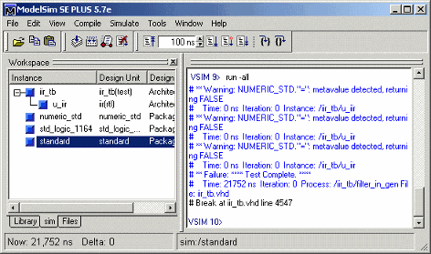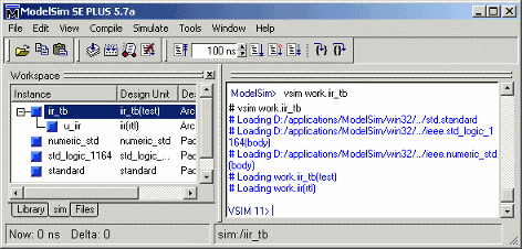 На следующем экране показаны результаты загрузки work.iir_tb с vsim команда.