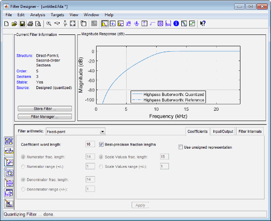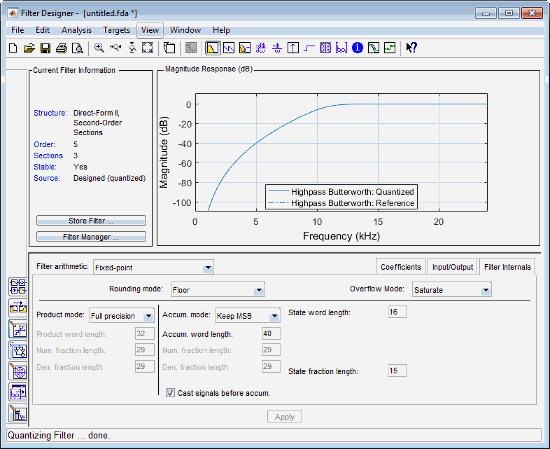 Дополнительные сведения о квантовании фильтров с помощью конструктора фильтров см. в разделе Использование конструктора фильтров с программным обеспечением DSP System Toolbox.