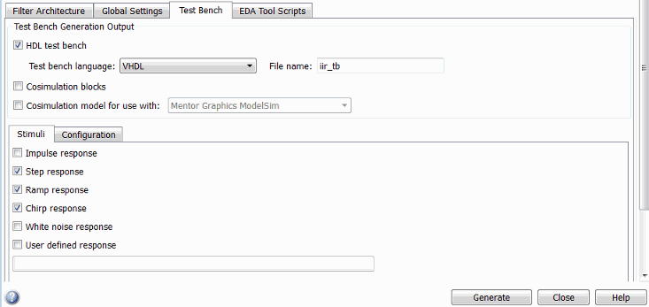 Перейдите на вкладку Test stench (Испытательный стенд) в диалоговом окне Generate HDL (Генерировать ЛПВП). В текстовом поле Имя файла замените имя по умолчанию на iir_tb. Этот параметр определяет имя созданного файла тестового стенда.
