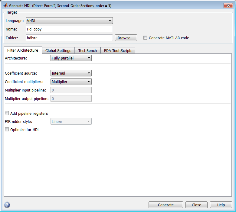 Запустите пользовательский интерфейс кодера HDL проекта фильтра, выбрав «Цели» > «Создать HDL» в диалоговом окне «Конструктор фильтров». Конструктор фильтров отображает диалоговое окно Генерировать ЛПВП (Generate HDL).