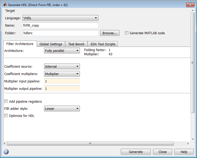 Альтернатива командной строки: generatehdl функция со свойством FIRAdderStyle или AddPipelineRegisters для оптимизации окончательного суммирования для фильтров FIR.
