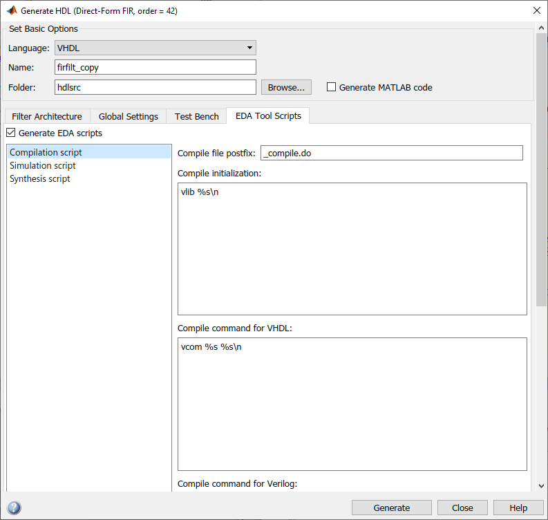 Кодер генерирует сценарий с именем firfilt_copy_compile.do: