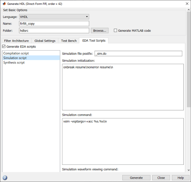 Кодер генерирует сценарий с именем firfilt_copy_tb_sim.do: