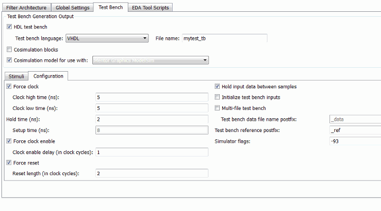 сценарий моделирования: настройка сценариев для имитаторов HDL. См. раздел Параметры сценария моделирования.