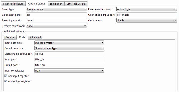 Кодер активизирует поле Clock enable output port только при генерации кода для многоскоростного фильтра с одним входным синхросигналом.
