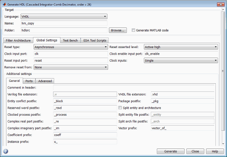 На следующем рисунке показаны параметры по умолчанию диалогового окна «Создание HDL» для поддерживаемого фильтра CIC.