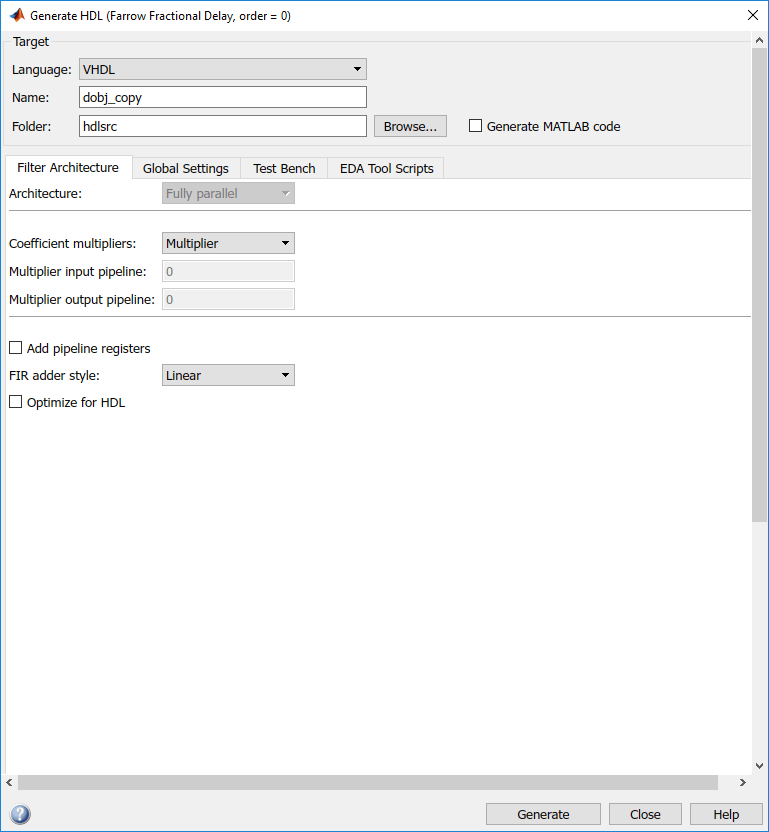 Выберите «Цели» > «Создать ЛПВП». Конструктор фильтров отображает диалоговое окно Генерировать ЛПВП (Generate HDL).