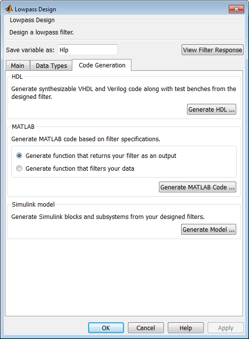 На панели «Создание кода» нажмите кнопку «Создать HDL». Эта кнопка открывает диалоговое окно Генерировать ЛПВП (Generate HDL), передавая текущий объект фильтра из Построителя фильтров (Filter Builder).