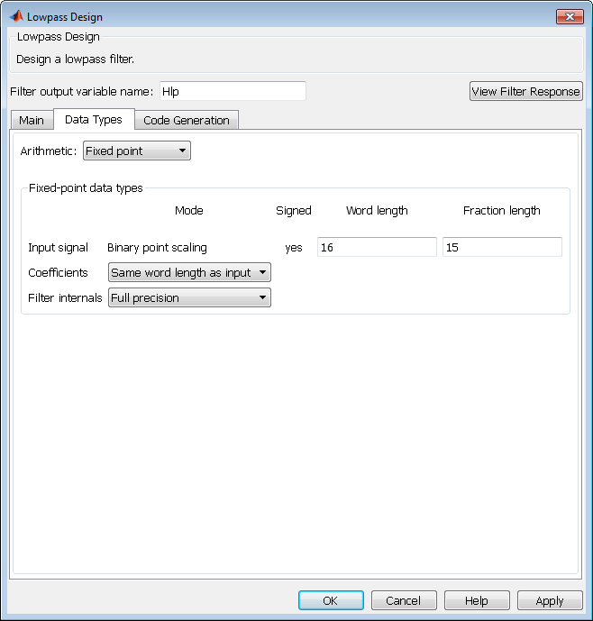 Перейдите на вкладку «Типы данных». Задать арифметику как Fixed point и выберите типы данных для внутренних расчетов.